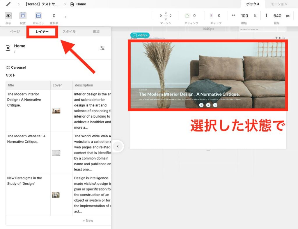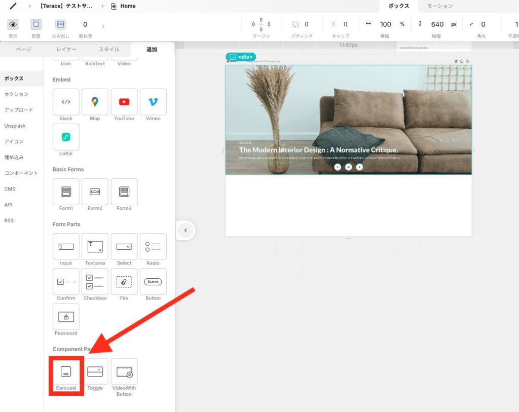 左パネルを開いて、「追加」→「ボックス」→「Carousel」をクリックします。