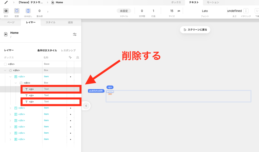 「Box」を開くと、「Text」が3つ表示されたはずです。1番上のTextと1番下のTextを削除します。