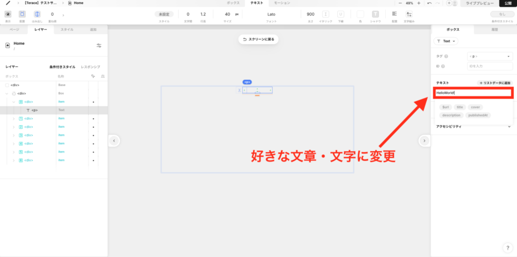 右パネルのテキストの部分を、好きな文章に変更します。