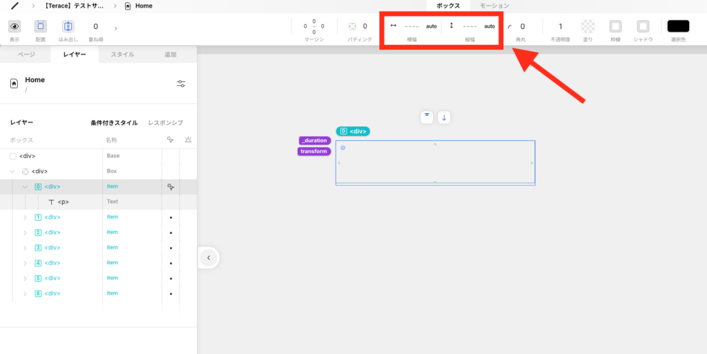 そして横幅と縦幅を、両方とも「auto」に設定します。