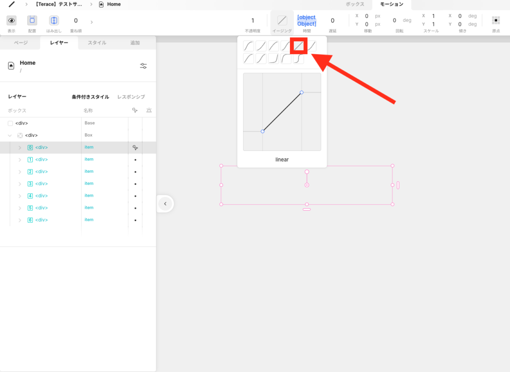 上部メニューのモーションを選択して、イージングを「Linear」に変更します。