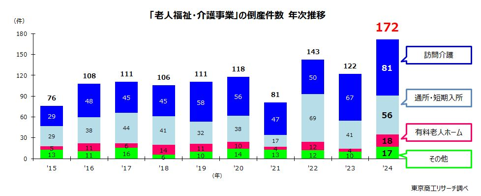 2024年、デイサービスを含む通所サービスの倒産は56件に上り、倒産理由の72.6%が売上不振でした(出典:東京商工リサーチ:2024年介護事業者倒産)。